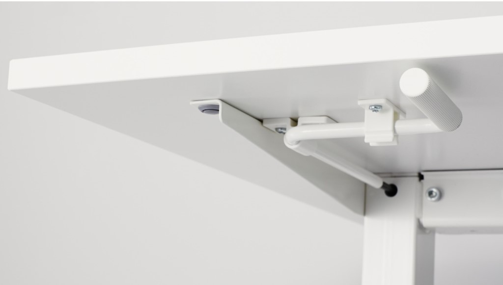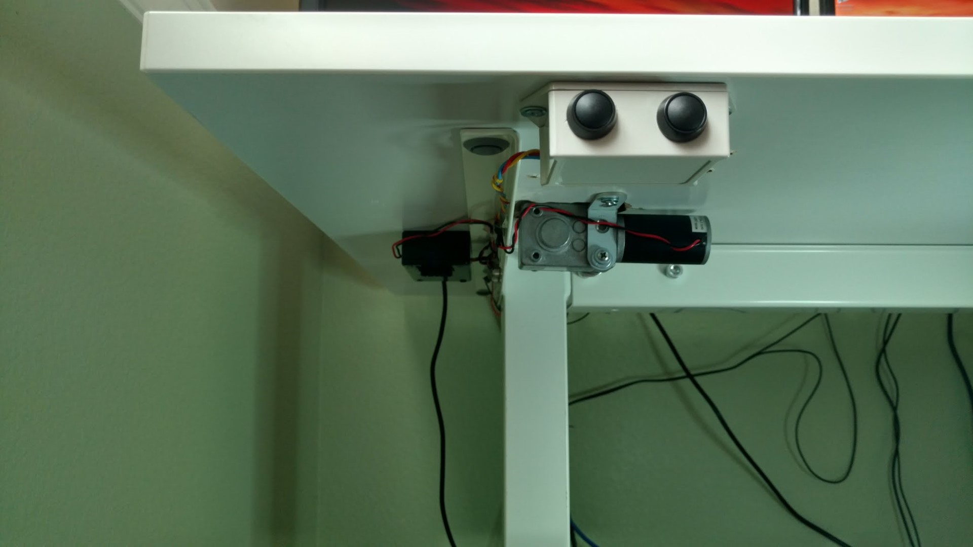 Details The image below on the left from Ikeas website shows what the desk looked like before, and on the right shows the finished product. I attached a small white junction box to the front of the desk with 2 buttons for raise and lower. The color of the box matches decently well which I'm pretty happy about.