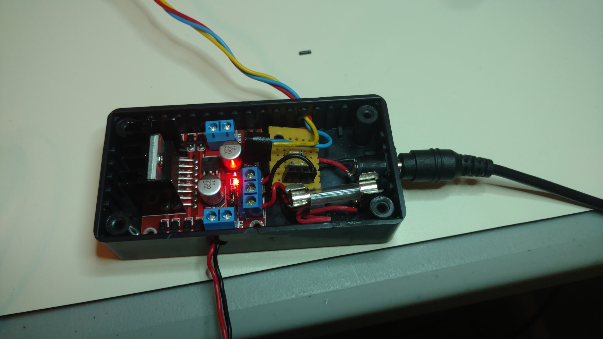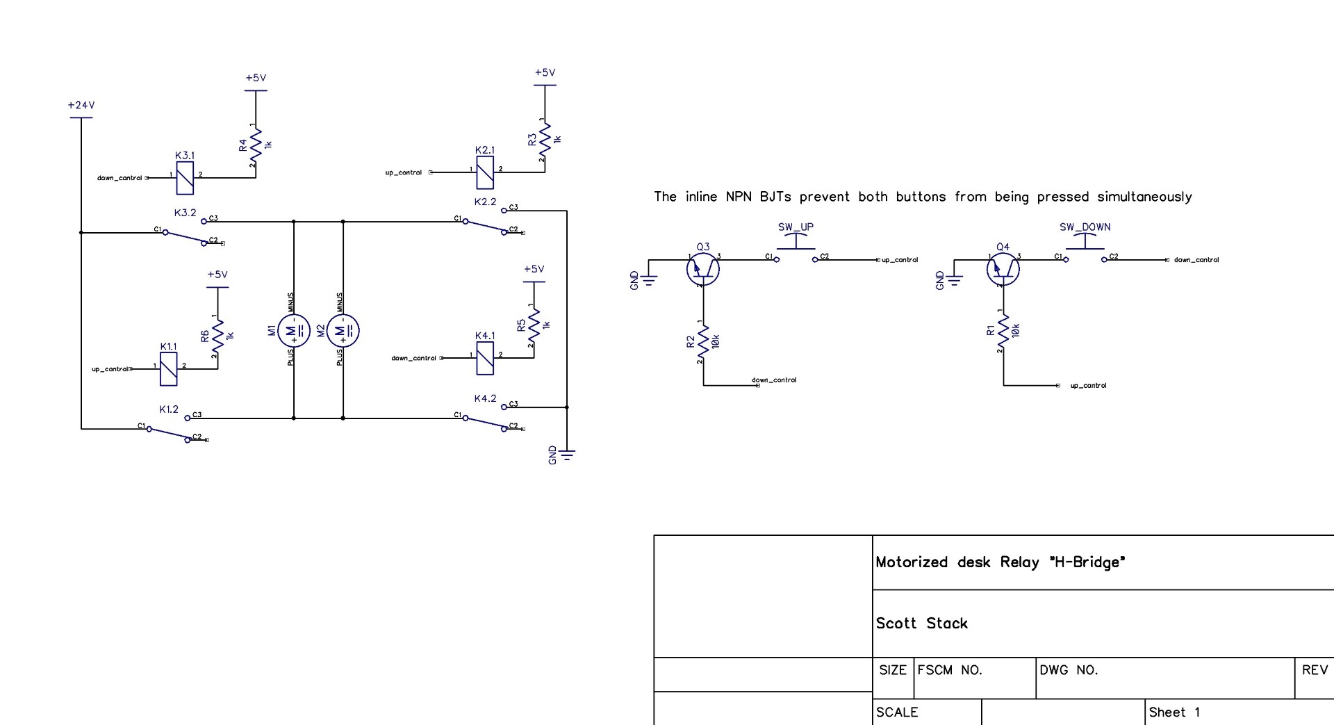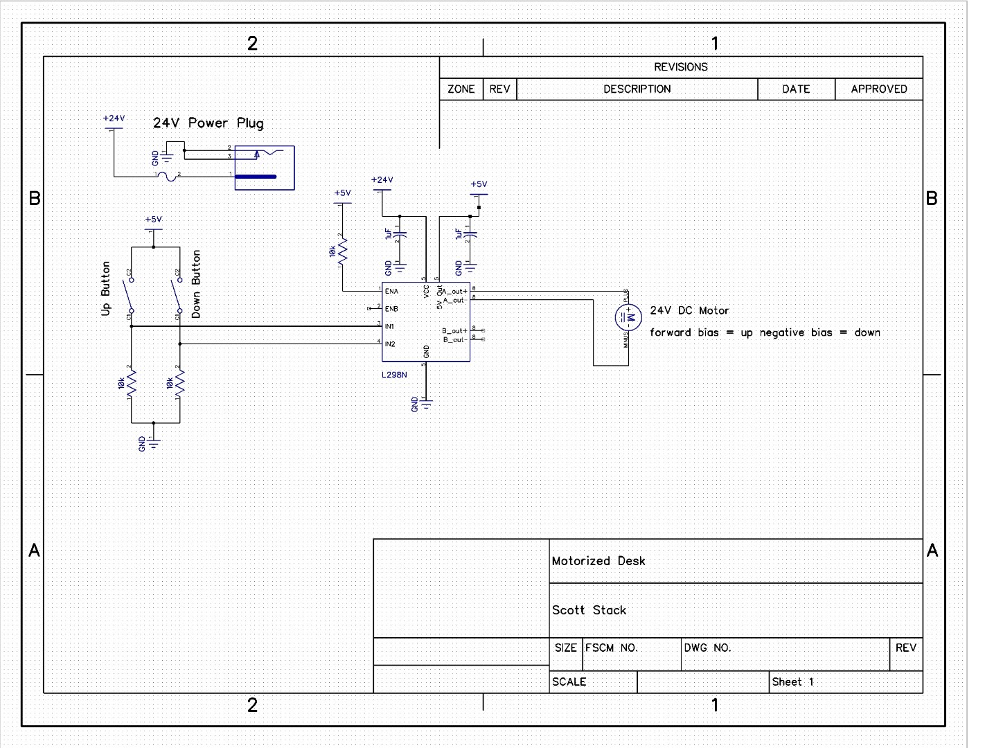 In order to fit the 2 motors, I had to cut the handle off of the shaft and attach the motors to each end. I actually started with one motor, but once I had everything together, it wasn't powerful enough to move the desk :/ . So I had to buy another one of the same thing and attach it to the other end of the shaft. The electronics are fairly simple. I bought an h-bridge module from amazon that already had screw terminals for the connections and everything. It was really just a matter of connecting the buttons up to the inputs of that module and putting it in a nice project box to make it look ok. Below is an image of the schematic and finished product in the project box.