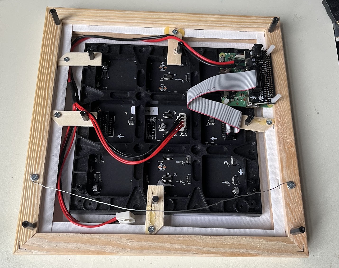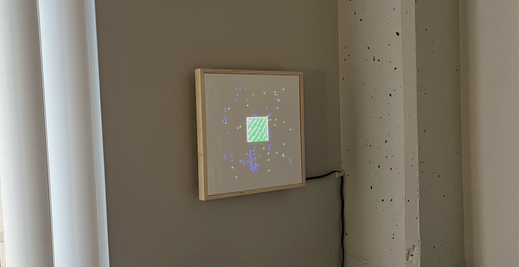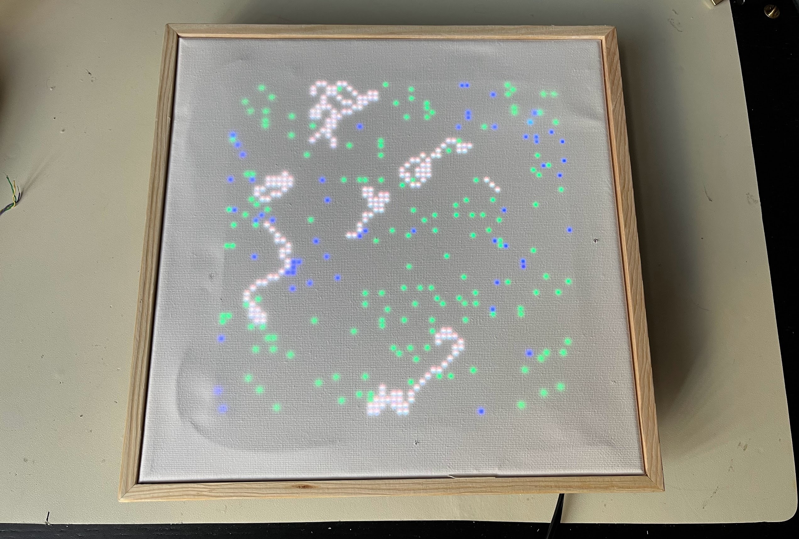 Overview A little art piece that simulates pixel creatures with neural network "brains". This was mainly a way to show off a software project I was working on to learn Rust: https://github.com/spstack/evolution-sim The basic idea is that each little pixel creature has a small neural network "brain" that allows it to take in input and perform an action in response at every step of the simulation. If a creature lives long enough to find food, it'll reproduce spreading it's brain structure to the next generation (with optional random mutations). The result is that, over time, the creatures should "learn" to be better at finding food and intelligent-ish behavior should emerge. It's pretty fun to watch the simulation progress and see what kinds of strategies the creatures start to adapt. The actual hardware here is just an LED matrix behind a blank white canvas. The canvas diffuses the LEDs really nicely, and I'm pretty happy with the way it looks! The idea came from a post on the Adafruit website: https://learn.adafruit.com/use-an-art-canvas-to-diffuse-RGB-matrix It's being driven by a raspberry pi running a custom version of Linux built using Yocto. Definitely wasn't necessary, but I wanted an excuse to learn a bit about Yocto as well :)
