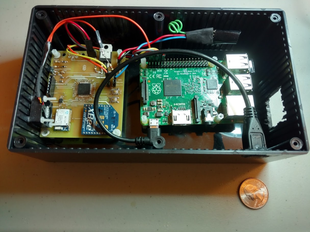 The base station consists of a rasberry pi 2 and a second custom PCB that includes a PIC microcontroller, a zigbee radio module, a generic 434MHz radio module, a blueooth module, and