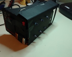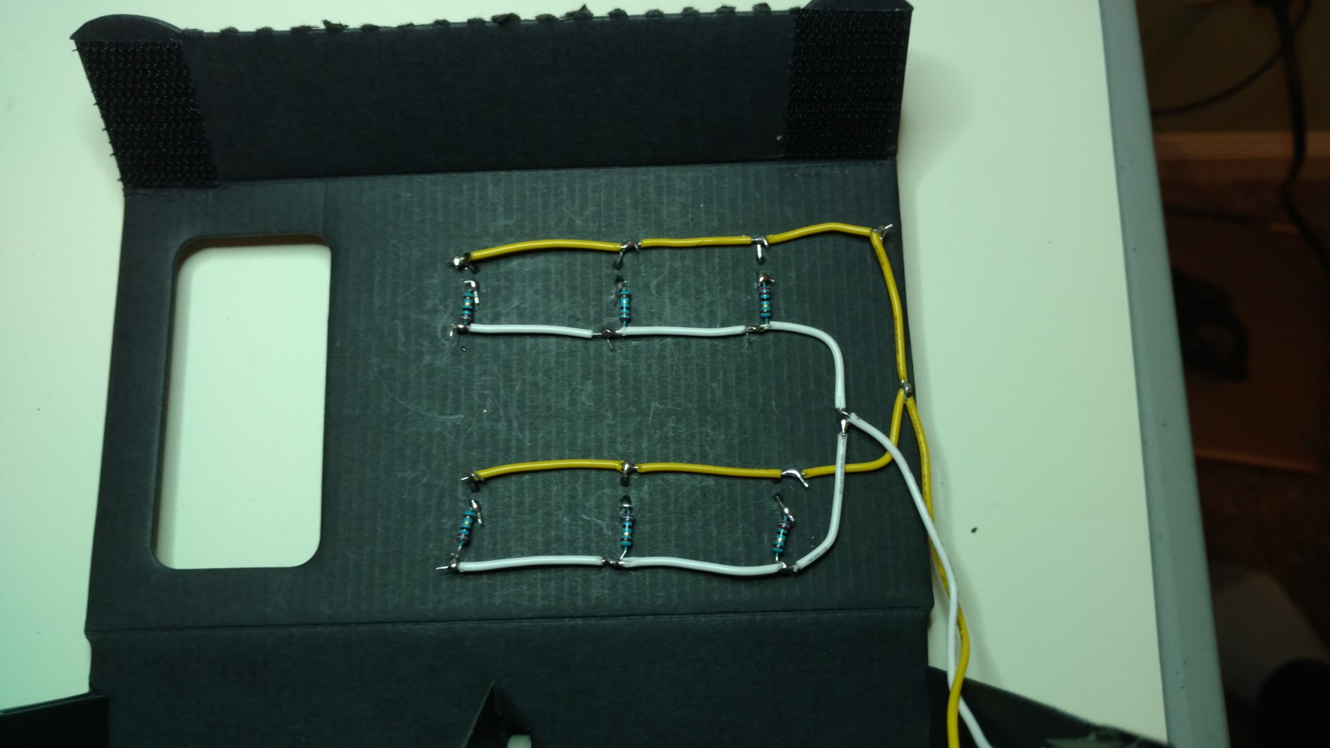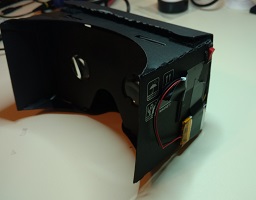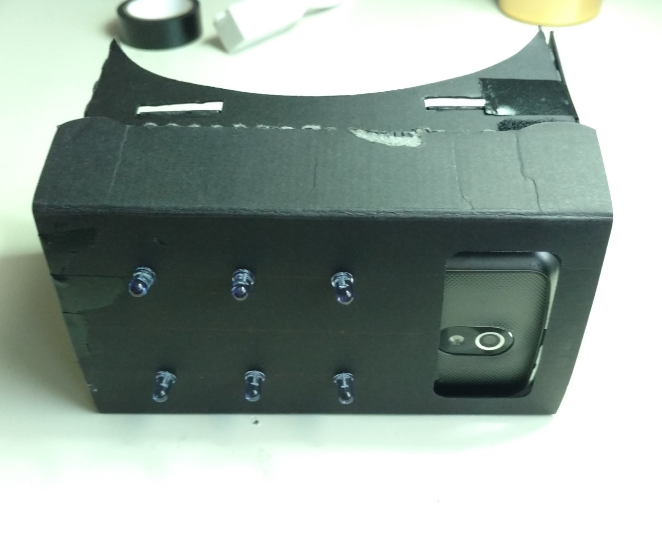 Once the IR filter was out of the phone camera, I started attaching some IR LEDs to the outside of the google cardboard. I bought some 'super bright' IR LEDs from amazon that can handle up to 100mA of continuous current each @1.6V forward voltage drop. I was going to put 9 of them on the front, but that seemed like total overkill after seeing how bright these things are, so I only ended up putting 6 on the front. I'm using a lithium ion battery pack from sparkfun to power the LEDs, and have a power switch attached to the cardboard that will turn them on and off.
