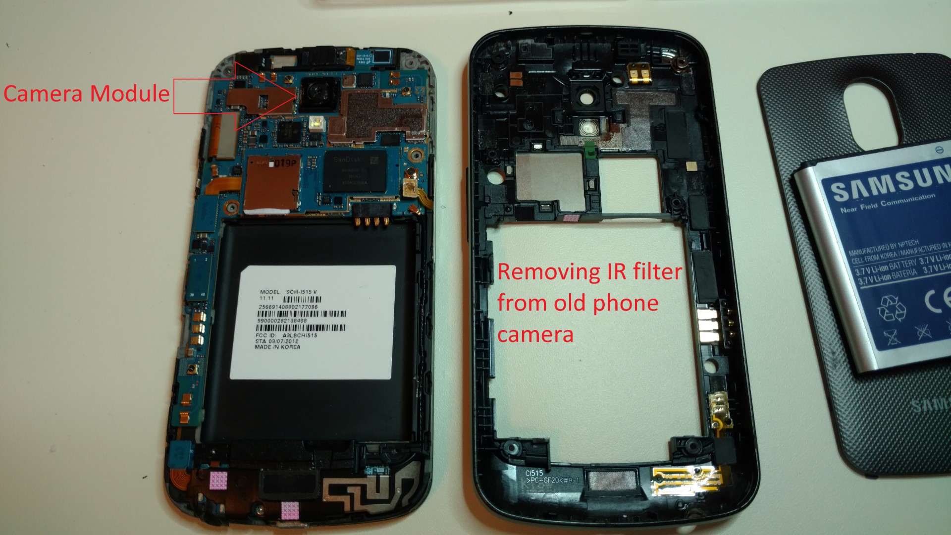 Details I was hoping that the IR filter in the phone camera wouldn't interfere too much, but unfortunately that didn't turn out to be the case. I had to remove the IR filter from one of my old phones instead. I found a great tutorial on how to do that here: Modify Google Galaxy Nexus for NIR. It wasn't too difficult, but was a lot more involved than I was expecting. Here are some pics of the process