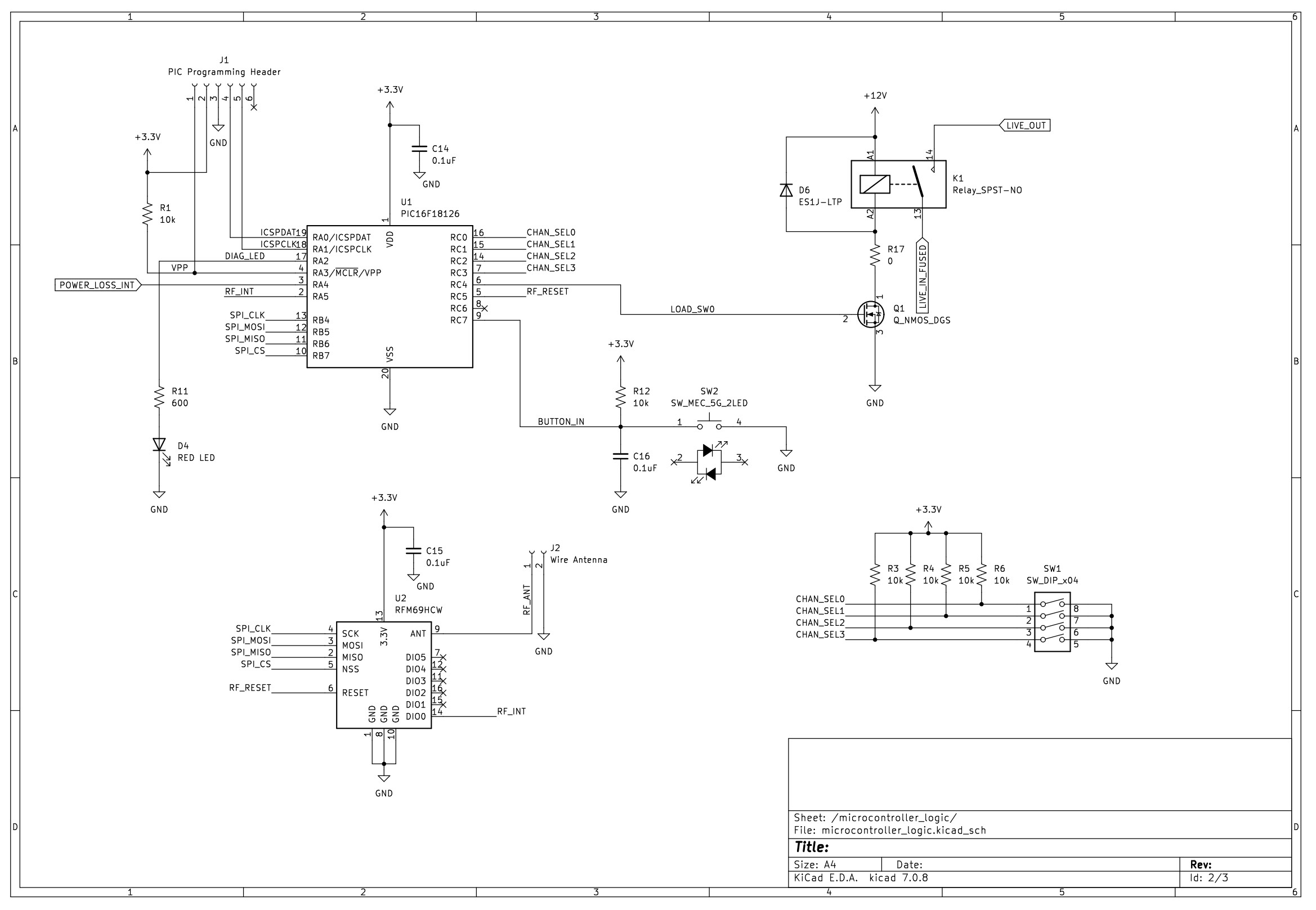 The board was designed in KiCAD and manufactured by JLC PCB. The main components are a PIC microcontroller connected to an RFM69HCW wireless transceiver.